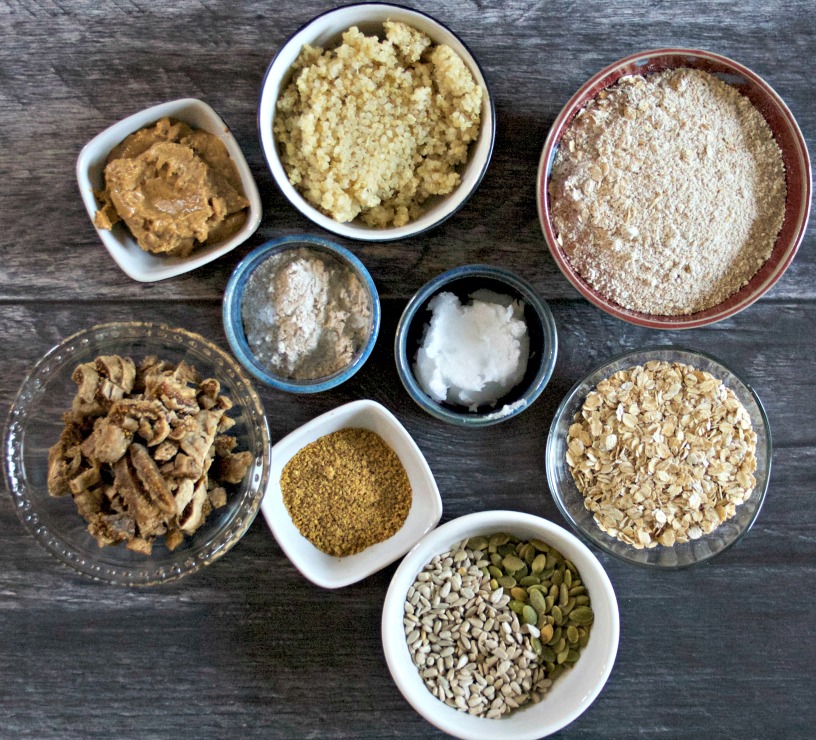 In a large bowl combine oats, quinoa, four, flaxseed and salt and mix well, breaking up any quinoa lumps along the way.