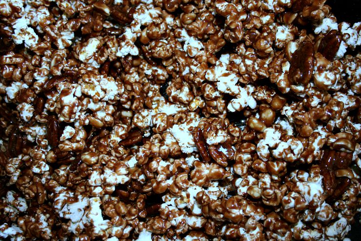 Put popcorn and mixed nuts into a large roasting pan and set aside.